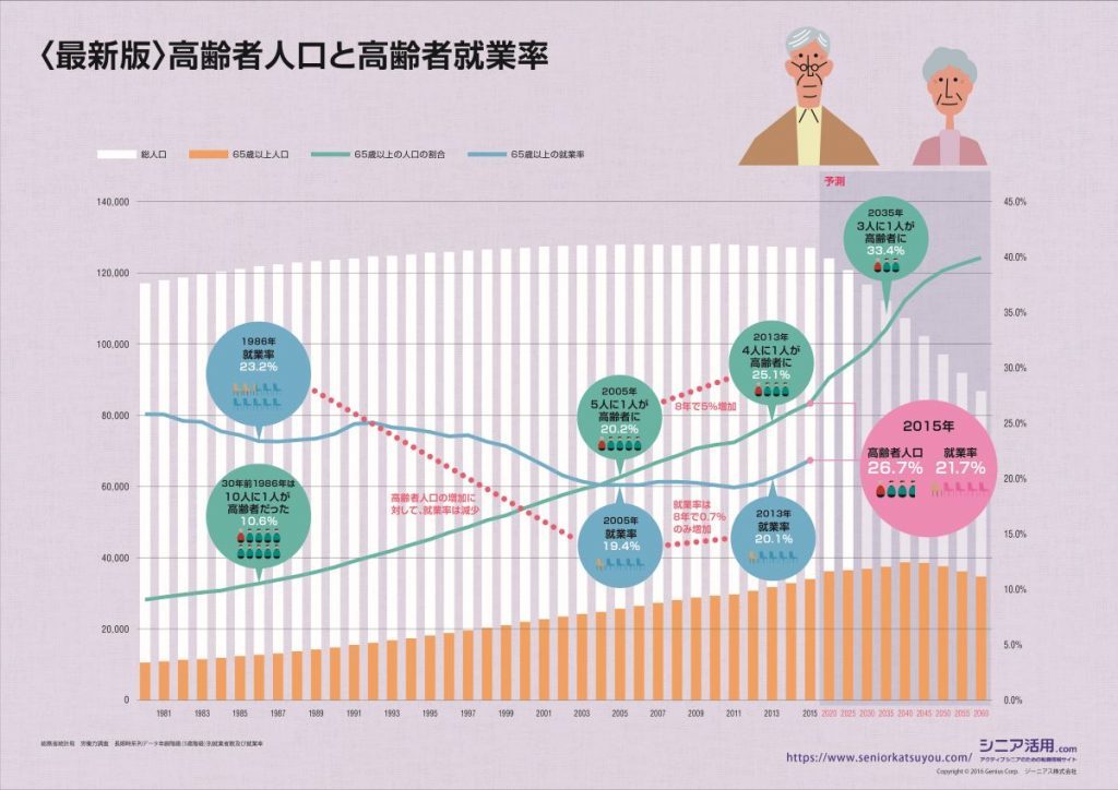 「65歳超えても働きたい」6割以上 16年厚労白書公開日:2016.10.11厚生労働省は4日、2016年版の厚生労働白書を公表した。60歳以上の人の6割以上が、65歳を超えても仕事をしたいと考えていることがわかった。高齢者の就労に対し、国が取り組むべき施策をきいたところ、企業が高齢者を雇いやすくする施策や希望者全員が65歳まで働けるしくみづくりなどが挙がった。 白書のタイトルは「人口高齢化を乗り越える社会モデルを考える」で、高齢化に直面する日本の現状や課題をまとめた。日本の65歳以上の人口は2015年に26.7%となった。高齢化は今後も進み、2060年には65歳以上の割合が39.9%になる見通しで、人口の2.5人に1人が高齢者という計算になる。 白書は高齢者の就労意欲の高さを指摘。60歳以上を対象にした調査では65.9%が65歳を超えても仕事がしたいと考えて...